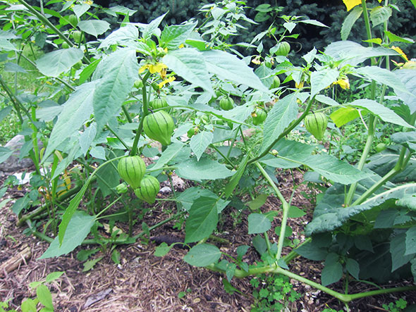 Last fall, I also threw out some overripe tomatillos which have flourished in the garden. I didn’t really expect them to propagate but, considering the amount of seeds the fruit produces in one slice of tomatillo, I should not have been so surprised. I was most fortunate in that several plants took root as tomatillos need pollination buddies. The plants loaded up with blossoms and, most recently, beautiful blue-striped lanterns which house developing green orbs. The fruit will mature in another month or so, and until then I must ensure each plant get an inch and a half of water so that its fruit plumps up good. A single plant can produce as much as 10 pounds of tomatillos. I’ll need to get out there soon and stake the vines so that they can carry the accumulating load.