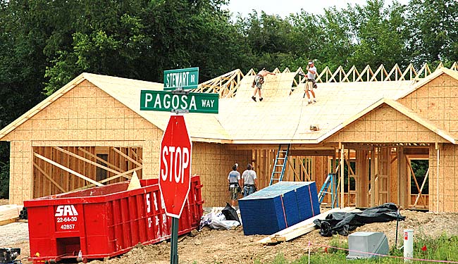 Construction has picked up at the Birch III development on the village’s south side where 21 houses are completed or under construction in the 40-lot subdivision. This week workers from Trippensee Construction erected the roof on a custom home built for an out-of-town couple. On the roof are, left, Tyler Ball and Bobby Trippensee. On the ground are Terry Kitts and Ron Smith. (Photo by Megan Bachman)