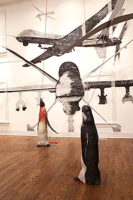 Black and grey drones formed by the words of former drone pilots litter the wall of the gallery’s main installation. One drone reads: “Did we just kill a kid?…Yeah, I guess that was a kid,…Was that a kid?…No. That was a dog,…A dog on two legs?” In the foreground, penguins stand with their young flying what would be kites. But instead, attached to threads of red yarn, they fly drones in the air above. Elsewhere in the gallery, photo transfers of soldiers in desert scenes and Iraqi civilians hang side-by-side, grainy and faint as the memories themselves. A video of American soldiers moving their bodies in expression of the chaos, terror, shock and confusion of their experience overseas plays in the gallery loft. And a collection of books by veterans depict stories like the project former U.S. Marine Ehron Tool started, sending tea cups as peace offerings to United Nations ambassadors such as John Negroponte of the U.S. and Adolfo Aguilar Zinser of Mexico.