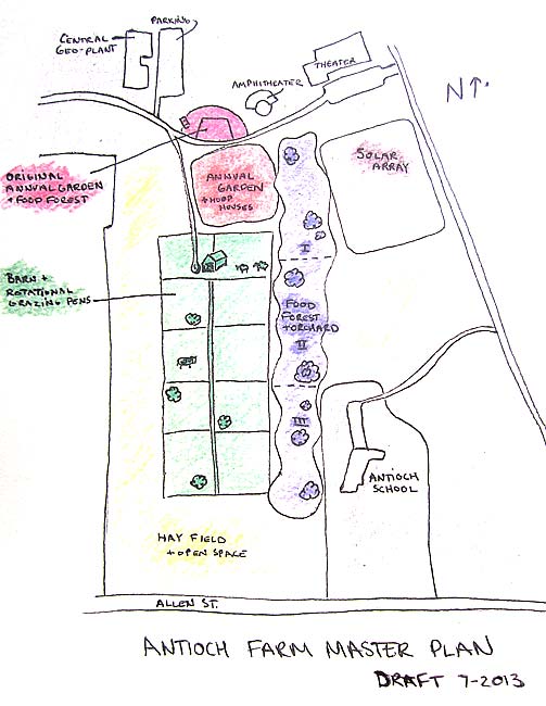 A conceptual rendering of the Antioch College farm by farm manager Kat Christen illustrates the multi-use plans the college envisions for the property long known as the golf course. Representatives from the college will present a revised land-use plan to Village Council on Monday, Aug. 5, with hopes of getting the zoning code to permit a certain number of farm animals on the property, to be used mostly for academic experimentation in sustainable agriculture. (Map courtesy of Antioch College)