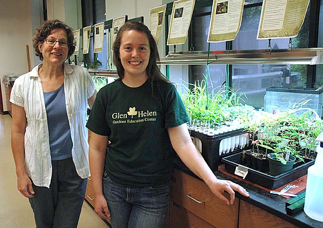 Antioch College environmental science professor Linda Fuselier, left, and Glen Helen extension naturalist Jennifer Lang will use a grant from the National Center for Science and Civic Engagement to launch an education and action program this fall to replace the Glen’s invasive honeysuckle with native understory species. (Photo by Lauren Heaton)