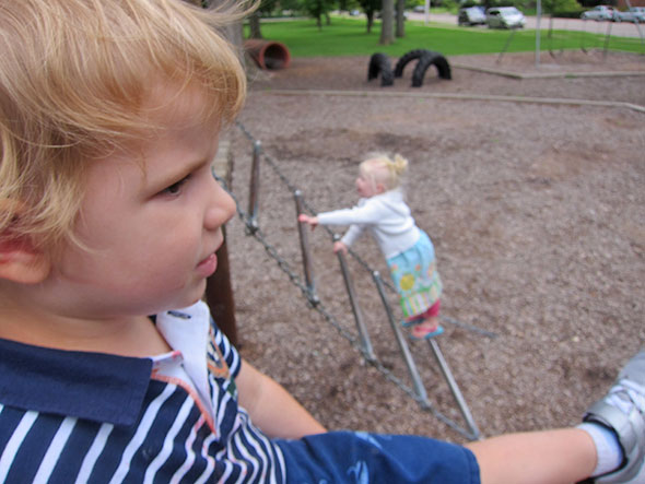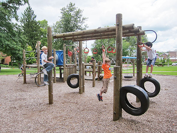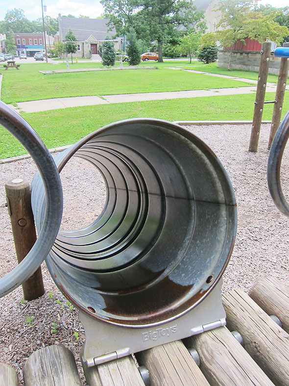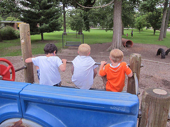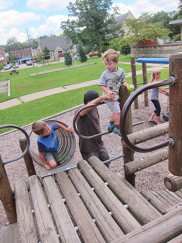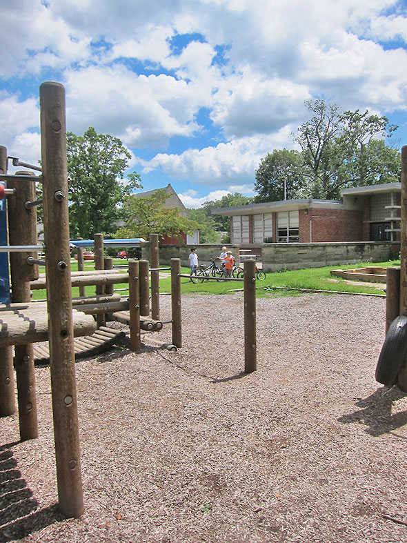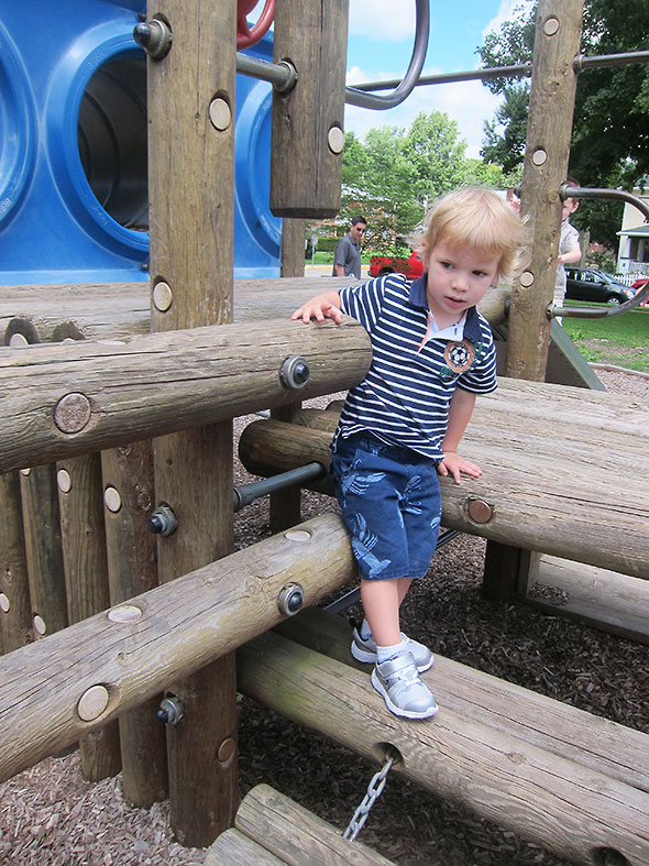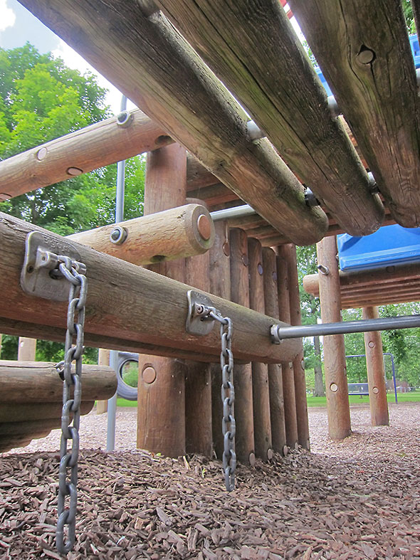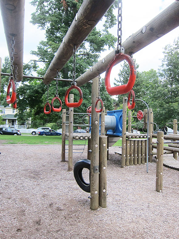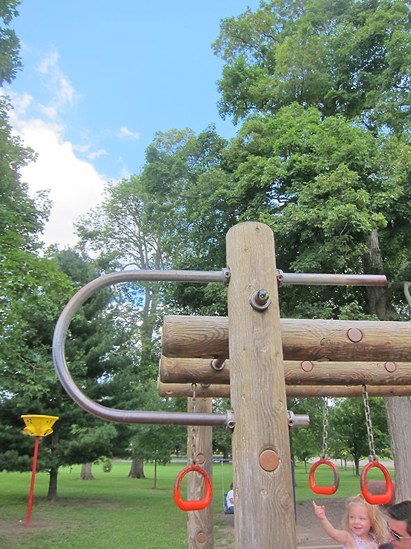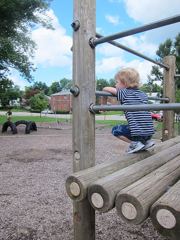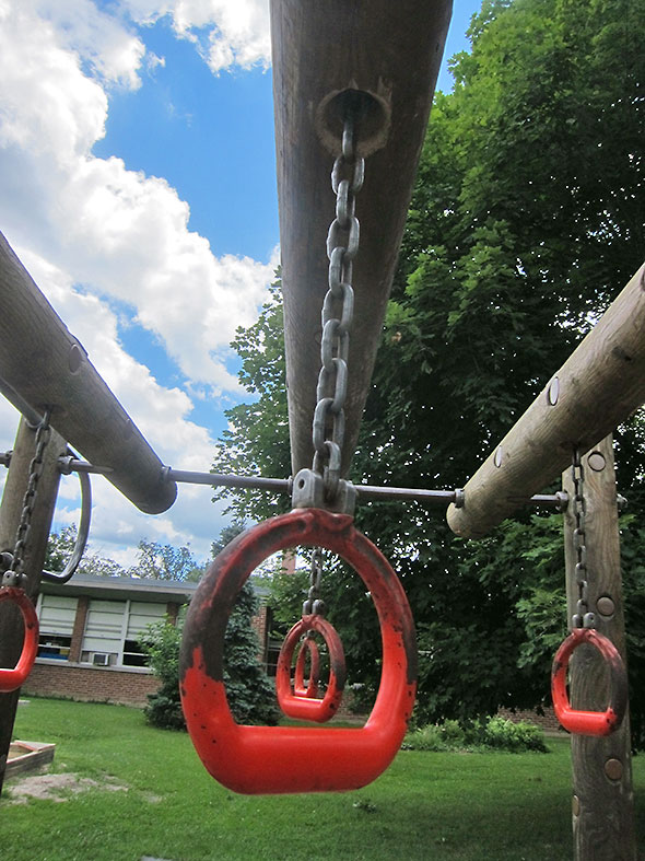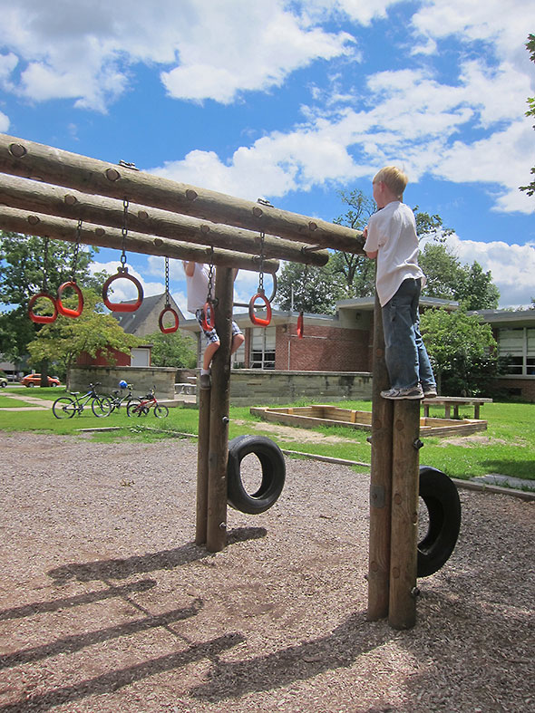 As we played on that Sunday afternoon, the neighborhood families kept coming and coming. Everyone’s children lingered on their favorite elements. Some flipped themselves upside down on the pull up bars and studied the bright blue sky above them. Others wrapped their bodies around great vertical-standing logs and stretched out to the traveling rings for one more swinging trip around the vaulted maze. The ones who knew consoled each other and blessed the day for supplying good weather and kind, supportive friends.