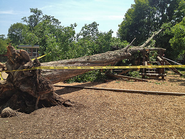 The Big Toy itself stood solid for decades. Then, suddenly, in a wild storm on 1 July 2012, a maple tree crushed full one half of the play structure. Tall and straight, the giant tree had sparse roots on its north side, and these failed following an intense Friday soaking and finally in the strong winds of that Sunday storm. The massive weight of the truck accordioned a spiral slide, crunched a windowed tunnel and connecting walkway, and splintered apart a set of overhead monkey bars.