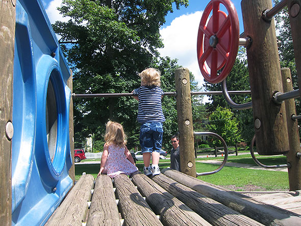 One of my favorite things about the Big Toy is it didn’t play favorites. Big kids and small kids could range upon it in full spirit. A 40+ year old woman, I boarded it myself and rarely felt pinched or out of place. The tree took out its higher, more challenging elements…all the ones I coached my children through (“Put a foot there and there. Now, reach here and pull!”)…but, in that leveling, placed the Big Toys’ playmates on near equal footing.