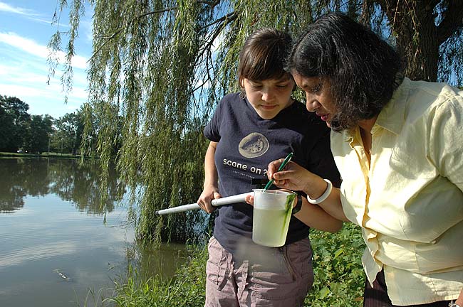 Assistant professor of biomedical science Savitha Krishna, right, and Antioch student Diana Harvey sampled the water at Ellis Pond this week in search of the larvae and pupae of mosquitoes that may carry the West Nile Virus. The Antioch biology class is working with the Green Environmental Coalition and Greene County Combined Health District to monitor and control the spread of mosquitoes in the village to prevent the potentially-dangerous illness. (Photo by Megan Bachman)