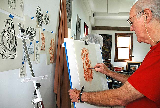 Local sculptor Brian Maughan is one of four artists selected for the Yellow Springs Experience: National Bronze Symposium, Oct. 13–26 on the Antioch campus. Last week at his home studio on N. Walnut Street, Maughan worked on preliminary sketches for one of the four contemporary bronze sculptures he will create during the two-week symposium. Later the 12 completed pieces will be erected as part of a downtown sculpture trail. (Photo by Megan Bachman)