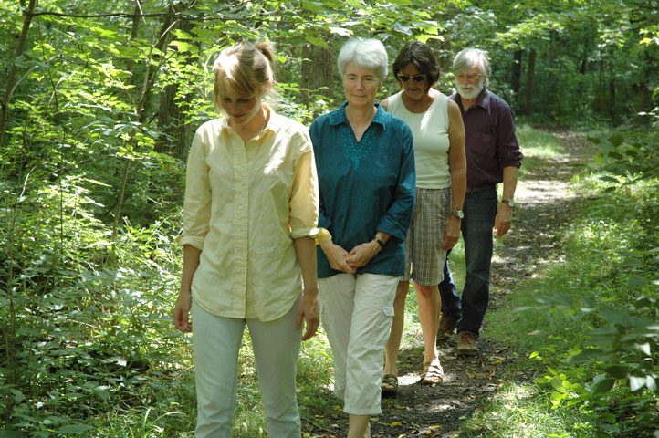 Monthly nature meditation walks in Glen Helen are from 4–5 p.m. on the last Sunday of the month through October with the next session this Sunday, Aug. 25. The sessions include an introduction to meditation, 20-minute silent hike, thoughts on the season from Bill Felker, 20-minute journaliing period and group reflection. Organizers demonstrating walking meditation are, from front, Antioch College student Charlotte Pulitzer, Dharma Center board member Katie Egart, Tecumseh Land Trust executive director Krista Magaw and Felker. (Photo by Megan Bachman)