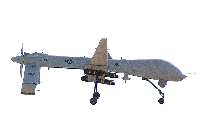 While the Predator does not drop bombs, it carries two Hellfire missiles.