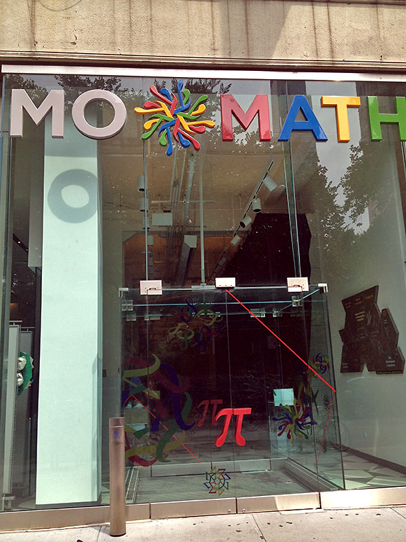 Sunday 12:05 – We walk to the Flatiron District. The way to MoMath takes us south past Madison Square Garden and the biggest post office I have ever seen. Eight blocks south and some five blocks east will get us to 11 East 26th Street. It is fortunate that we brought our umbrellas. They have ensured no rain for the duration of our visit.