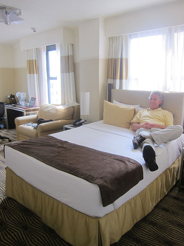 Saturday 2:55pm – Suddenly the hotel is a zoo as check in time arrives. We probably left it 5 minutes too late to get in line. Jeremy has our room keys after about 20 minutes. It’s worth the wait. We head up to the 24th floor to find a gold and cream colored room with views out onto the city on two walls. Jeremy has done well.