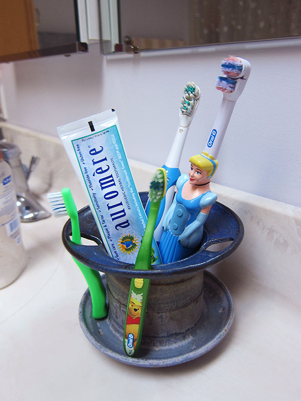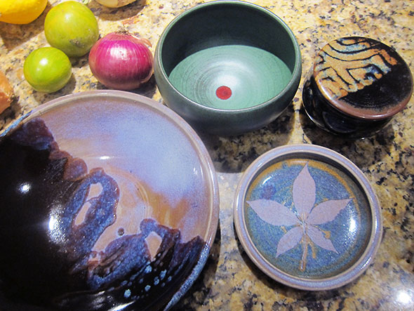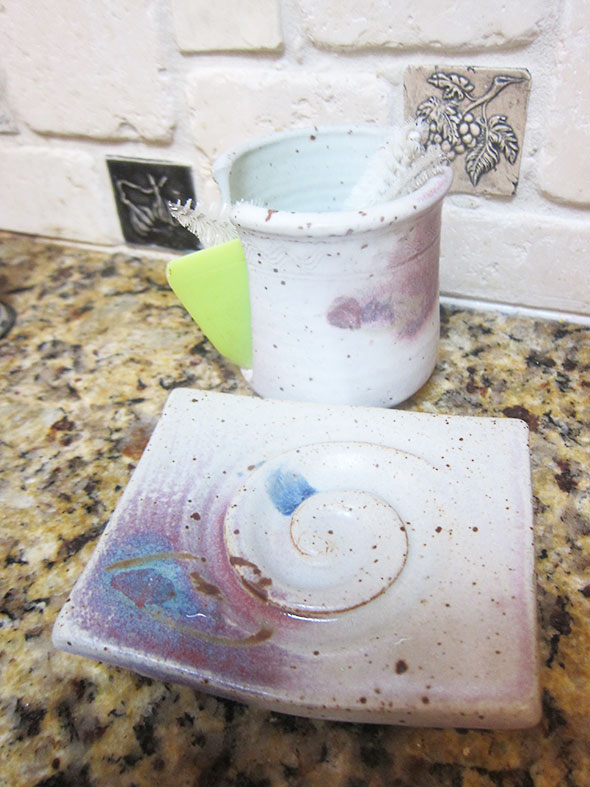 Other items from the pottery have found their place in our home. A toothbrush holder with a large central bowl solved our problem of how to keep our electric toothbrushes with the children’s traditional ones. Back in the kitchen, our soaps and sponges keep neat and handy in the dishes made by Keiko Hergesheimer. Lidded jars by Janet Murie hold station near the stove carrying salt to season and baking powder to lift our morning eggs and cakes.