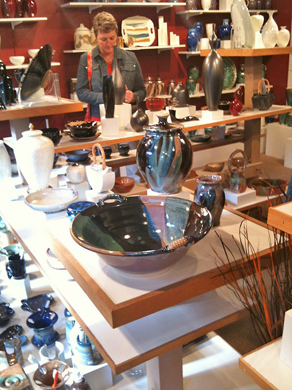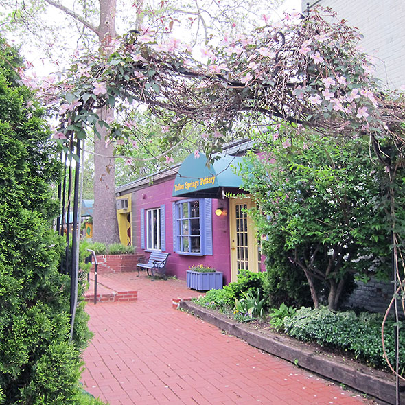 Anchoring the shops of Kings Yard, the store is just beyond a flowering archway. Lit by a south facing bay window, the artist cooperative brims with delightful creations. The work of its ten members hover on airy, layered shelves. Their pieces express a broad range of color, texture, and mood.