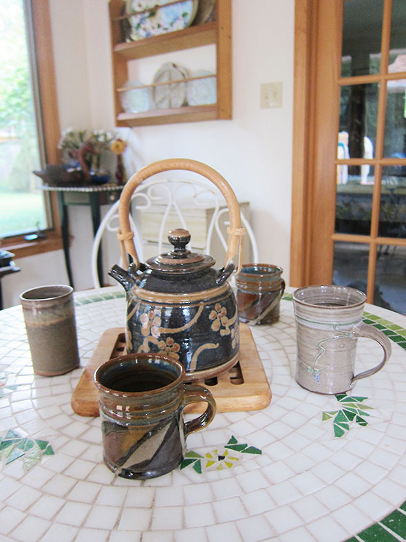 My first purchases were modest: small mugs to share cups of coffee with a friend or to sip the highly caffeinated chai that kept me awake throughout my graduate studies. In my twenties, I dreamed of owning a teapot or casserole dish by Evelyn LaMers. Imagine my delight at returning to the village 15 years later to find her still there at the pottery…her teapots as elegant as ever.