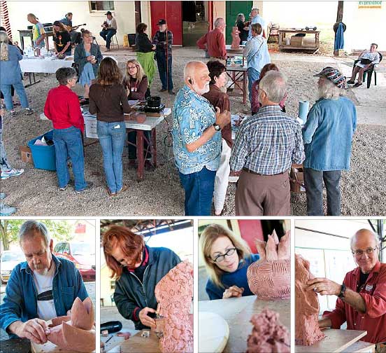 The village’s first National Bronze Sculpture Symposium, which has been taking place the past week and a half, concludes this Saturday evening at 7 p.m. with an outside bronze pour at the outdoor Antioch College foundry, adjacent to the Antioch Amphitheatre. Organizers say the symposium’s events have been well attended. Shown are, above, last week’s opening reception, and below, the four sculptors at work. From left are John Weidman of New Hampshire; D’jean Jawrunner of New Mexico: Susan Byrnes of Cincinnati; and Brian Maughn of Yellow Springs. (submitted photos by Dennie Eagleson)