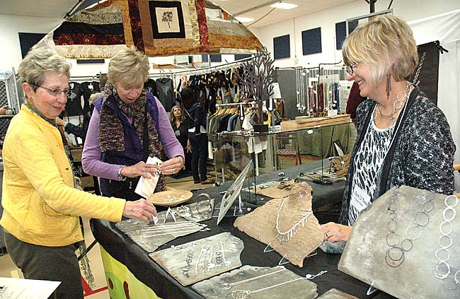 Thirty-one artists from Ohio, Kentucky and Indiana sold their wares, including, at top right, jewelry artist Janet Webb from Marion, Ind., who is showing her sterling silver pieces to Janet Heater, left, of Springfield and Phyllis Sloan of Mt. Vernon. The event donates a portion of ticket sales to the schools and the police coat fund; each organization received $392 from the event. (Photo by Diane Chiddister)