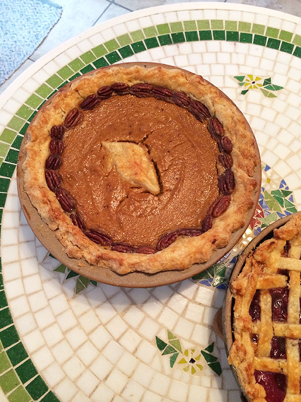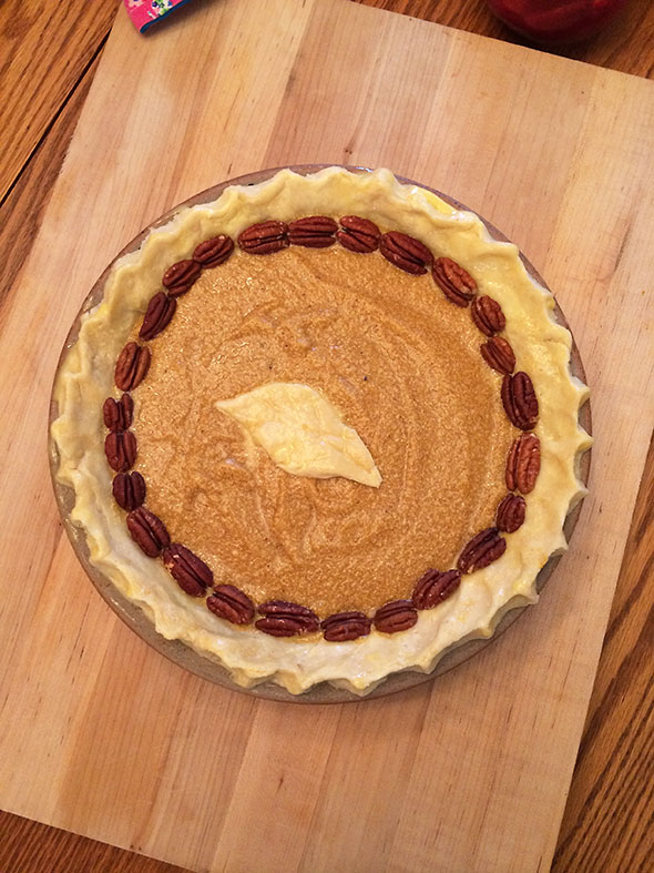 I poured the custard into a pie crust and topped it with a circle of pecans and a small leaf-shaped wedge of pie crust. While the oven preheated, I employed a new trick and set a baking sheet in the oven. Once the oven was ready, I set the pie plate on the baking sheet so that the bottom crust would receive an added dose of heat and not become soggy in the cooking process.