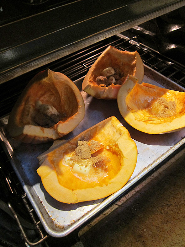 My daughter’s been keen on one for about a month now. Ever since pumpkins appeared at the farmers market this fall, she’s begged for pumpkin pie. I’d never attempted one, and her ambition frankly surprised me. I made a false start with the first pumpkin we brought home. I carved out its top stem and painstakingly hollowed out its seeds as if I were making a jack-o-lantern. It was destined for the oven at that point but, sadly, progressed no further. After sending it to the refrigerator for a spell, we turned to it again too late and, with great regret, assigned it to the compost pile.