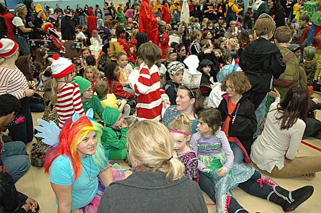 The parade came to a head at the all-school assembly, where teachers and aides put on silly 1-minute skits, as with eight or so teachers rearranging themselves to spell out “Halloween” with letters on the front of their shirts. It took them a while.
