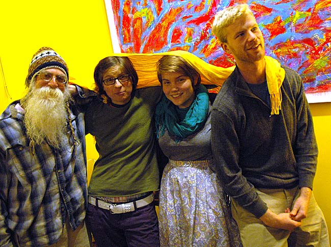 Four local poets, from left, Robert Paschell, Jenny Johnson, Abby Lybrook and Jack Whitacre, organized the Yellow Springs Community Poetry Jam, from 7 to 10 p.m. on Friday, Nov. 22. The poets, ranging in age from 19 to 65, will perform original work during a “free flowing evening” of poetry, music, improvisation and more. (Photo by Megan Bachman)