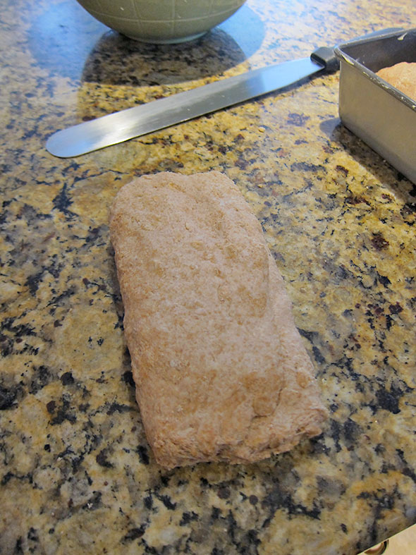 Practice makes perfect, and the second dough cylinder that I formed was more voluptuous than the first. Compared to the first loaf, I worried less about filling the 8 1/2 inch by 4 1/2 inch bread pan and refrained from pressing the dough down into the pan. This restraint help form produce a well formed loaf with a high domed top.