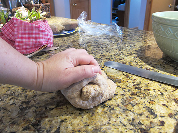 Paul Reinhart’s recipes are also graciously robust. We can bake bread step by step in our own time. The sandwich bread recipe requires a small initial investment of attention so I got the ball rolling and combined ingredients while we visited with our people at the kitchen peninsula. Preparing bread dough is one of those forgiving tasks that allow for inattention. Once the dough takes shape, it benefits from periods of rest. While I relax, the glutens in the dough are actively working to create the strong network of strands that will give bread its texture. When I pick up the dough again and stretch and fold it along several paths, I add strength and length to those stands. Once the dough transitioned from sticky to tacky, I placed it in a covered bowl and tucked it into the refrigerator to ferment over two nights.
