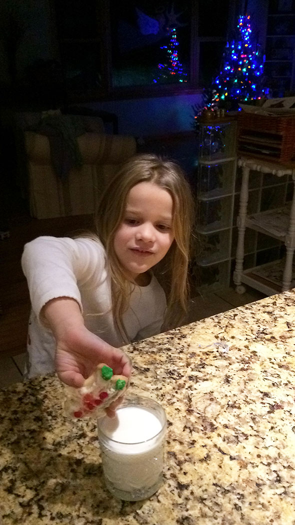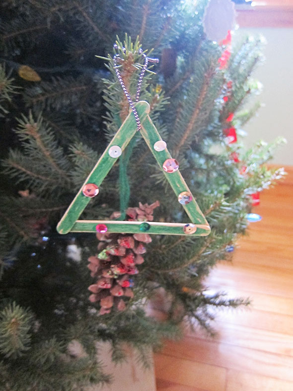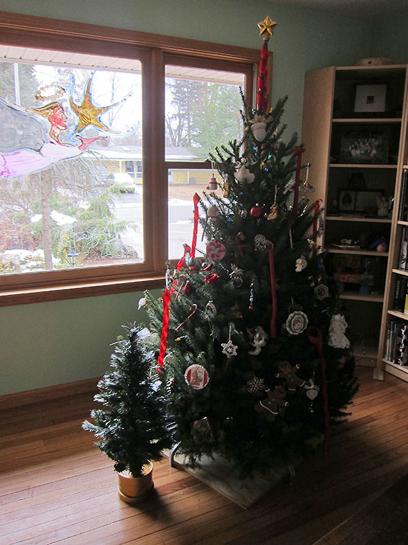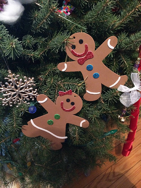 New ornaments from school and the children’s Breakfast with Santa at the Yellow Springs United Methodist Church, 202 S. Winter Street, were added to the tree: sequined wood and foam figures, beads and bells strung by the boy, and gingerbread people fashioned by the girl.