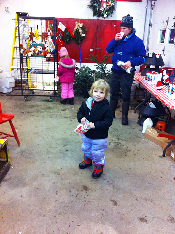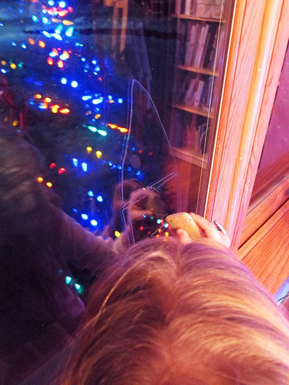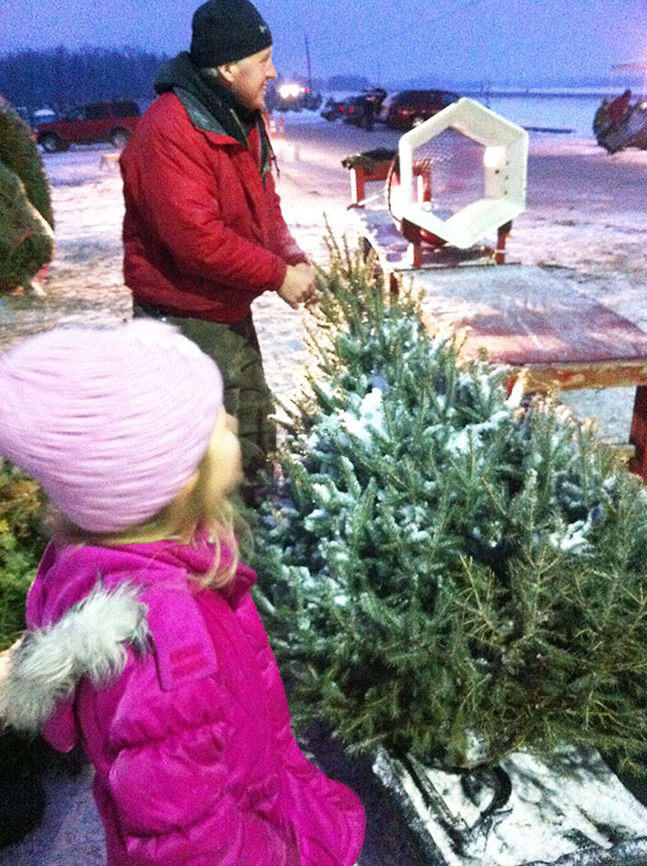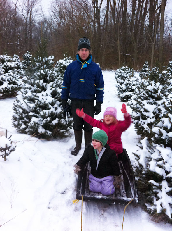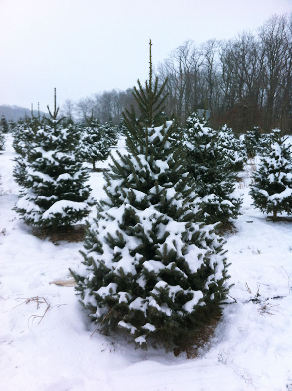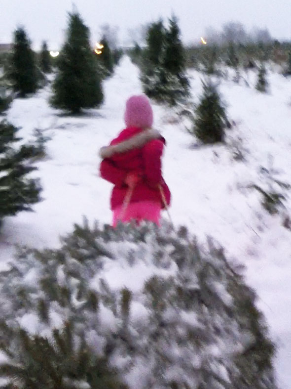 Between Thanksgiving travels and the constant snows, we did not get our outdoor lights up for the season. Still, our daughter—keen to our responsibilities to light up our little corner of the neighborhood as much as to her own pleasure—made sure that we set our priorities properly and that we secured a tree in the first weekend of December. Shepherding us out the door, she lead the tree hunting party across the fields of Young’s Christmas Tree forest. The firs and pines about us auditioned their comely silhouettes cloaked in branches heavy with—not ornaments—but snow. We found a six foot tree with a straight regale crown and a symmetric billowing skirt. Fighting to beat the fading twilight and a chilling drizzle, I cut the tree free, and our daughter hauled back in this beauty of a Canaan Fir. Pleased with the family’s efforts, she retired to the barn handing out hot chocolate and bags of popcorn to our party as our catch was baled and loaded atop the family station wagon.