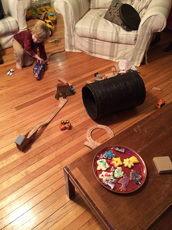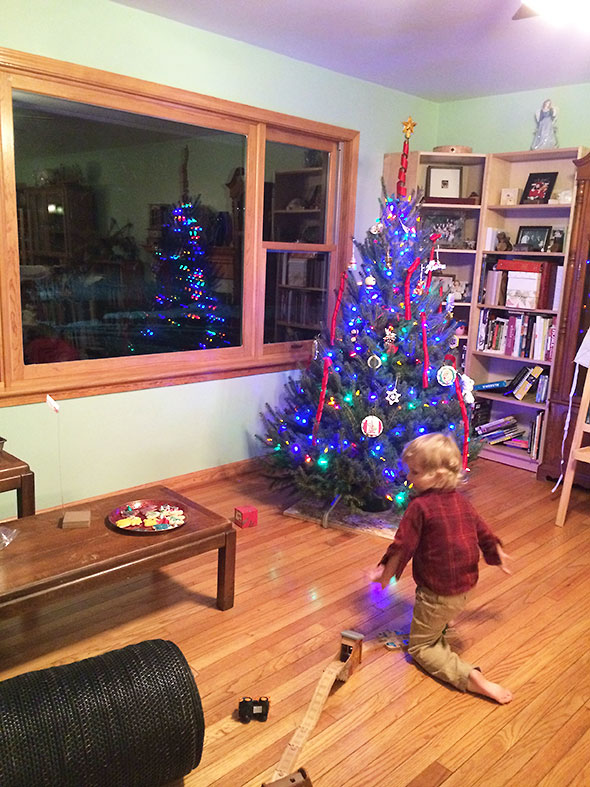 As the women of the family decorated the tree in red ribbon, white ceramic, and silver, the three year old diligently went about his own version of Christmas decorating: assembling his Thomas Train set about the tree. We dodged working engines, boulders, and bridges as tracks were laid about our feet.