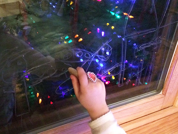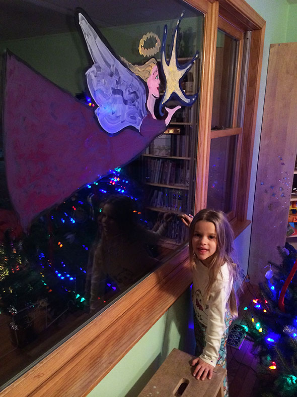 I refined the features of our angel’s face—reminiscent of a family friend, I notice—and my daughter picked up the soap. Below the angel in flight, she traced the earth-bound village below: a collection of modest buildings and—there below the star that the angel is setting in the sky—a bare stable with a baby and two parents brimming with unmistakable excitement, exchanging with each other words of hope and wonder.