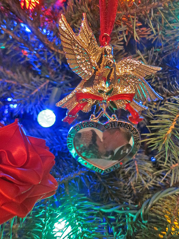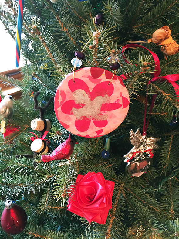 That night, we wrapped the tree from base to crown with the added string and toasted our success with milk and cookies frosted and shipped by Grandma Sandy and Grandpa David. As we dressed the tree with ornaments, my daughter pressed me to open one present early. The gift box that she presented me was a repurposed card holder adorned with winter birds. Inside was a jeweled ornament wrapped in pink and rose paper and stamped with a silver dove and the word Peace.