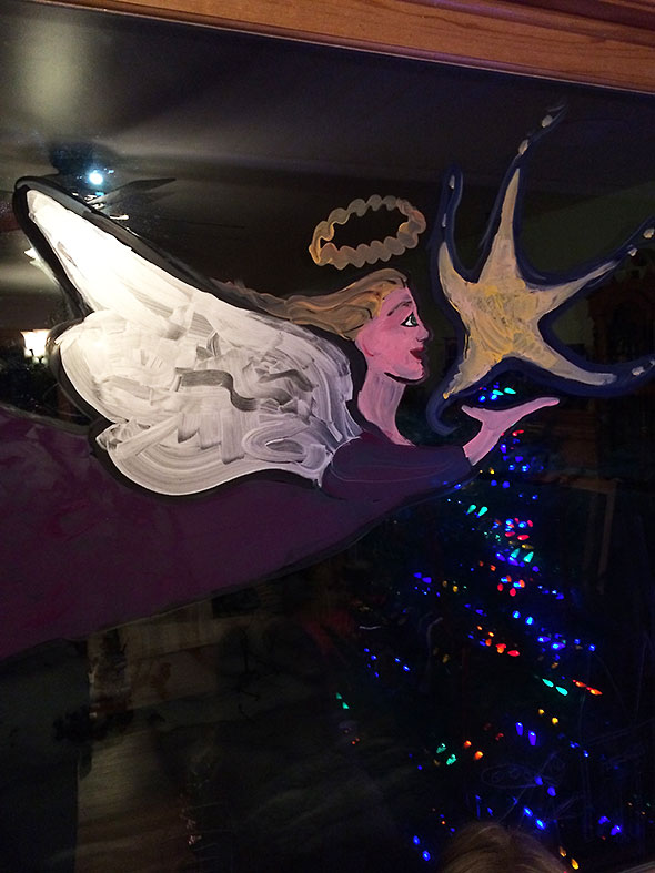 My husband remained a constant visitor to the scene adding his own touches and contributions. Giving the children a chance to say a fond farewell at the end of a prolonged but well received stay, he removed our friend the Great Pumpkin from the window. Wiping the last evidence of the fall holiday from the window, I picked up a bar of soap again and traced out a new figure—an angel—answering a request from the children.