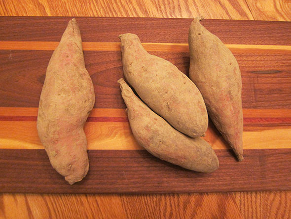 Now, if there is one food that I cannot warm up to, it’s hash. So please banish any thought that I am going to proceed at this point and cook hash for my family. The grainy texture and taste of potato, onion, and ham thrown together in tiny cut cubes was a childhood horror for me, and even still I shudder thinking of it. Substituting turkey provides no balm. I do like a good breakfast potato dish however; and so, after watching Chef Dufresne’s video that third time, I asked my mother if she had any potatoes and onions. The answer was one onion and one sweet potato. As far as I was concerned, that answer was the perfect.