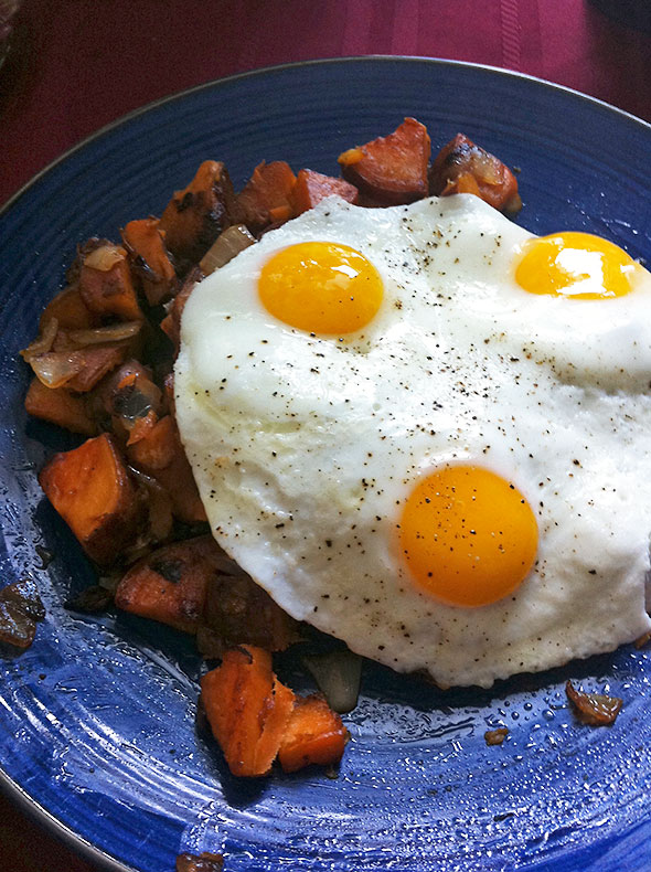 salt and pepper to tasteOver medium heat, sauté diced onion in butter and salt. As the onion turns translucent, add the grape juice and toss. When the grape juice reduces, add the sweet potato cubes and heat through. After 5 minutes toss, toss the vegetables with sherry and start the basted eggs while you wait for the sweet potatoes to caramelize.