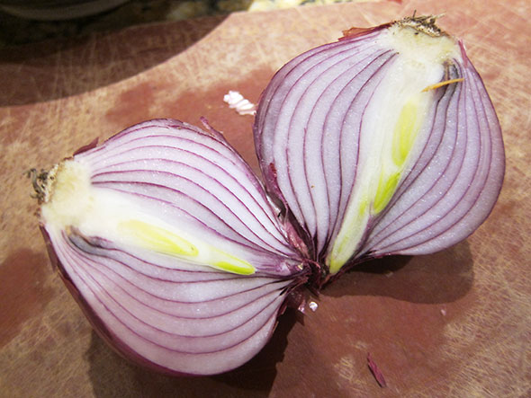 Next, turning the knife blade parallel to the cutting surface, I made three horizontal slices toward the root but not all the way through. The root keeps the onion together so I could easily turn the onion and, pointing the blade vertically and the tip of the knife toward the root, I made four vertical slices down. With one final turn of the onion, I made the final slices cutting crosswise to section the bulb into dice-sized pieces. This technique works because the root stabilizes the onion so that the diced pieces come out uniform.