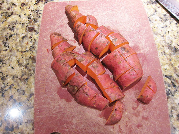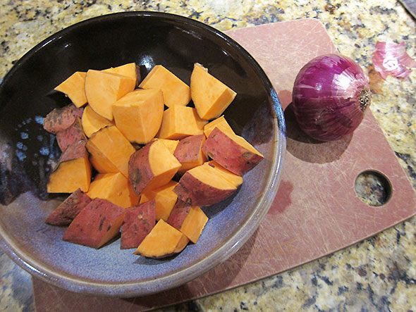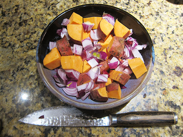 I diced the sweet potato into as evenly cubed pieces as I could manage…it was a dense root…and preceded with the onion.