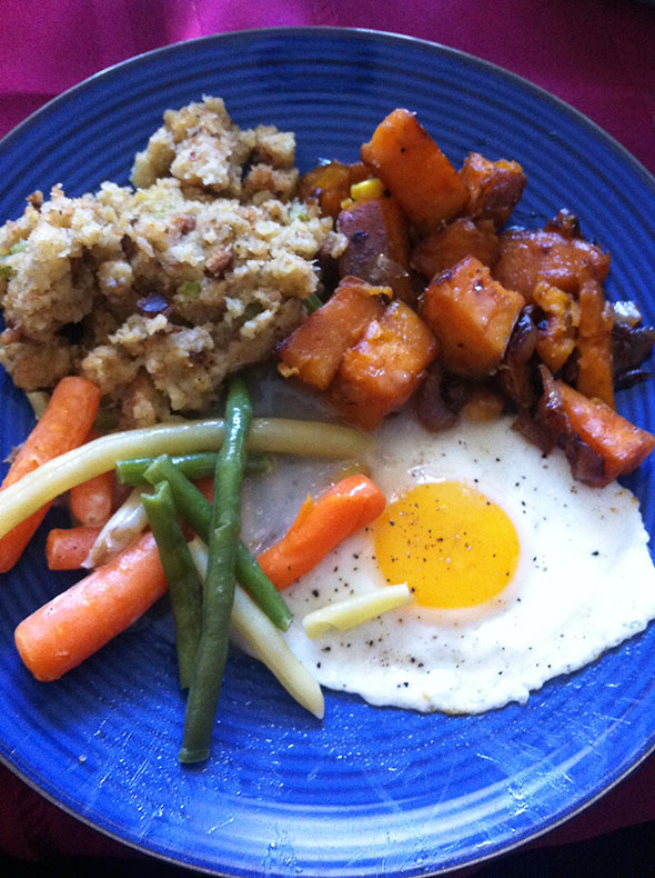 When I made this dish for a late morning brunch with the family, we paired it with leftovers from the Thanksgiving meal: stuffing, cranberry sauce, green beans, and even turkey gravy.