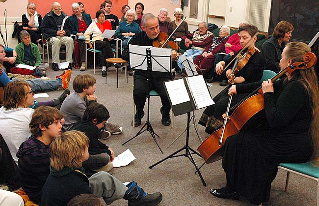 From left, Matthias Enderle, violin, and Wendy Champney-Enderle, viola, of the Zurich, Switzerland-based Carmina Quartet, will perform at the annual Friends Music Camp winter benefit concert at 3 p.m. Sunday, Dec. 29, at the Yellow Springs Senior Center. Here they perform at the 2011 concert. The Enderle family will perform this year with their daugher, Ciara, an up-and-coming cellist. Other Friends Music Camp alumni and instructors to perform at the concert include Martha Hyde, Martin Bakari, Minnita Daniel-Cox and local teen New Orleans-style brass band, Sassabrass. (Photo by Matt Minde)