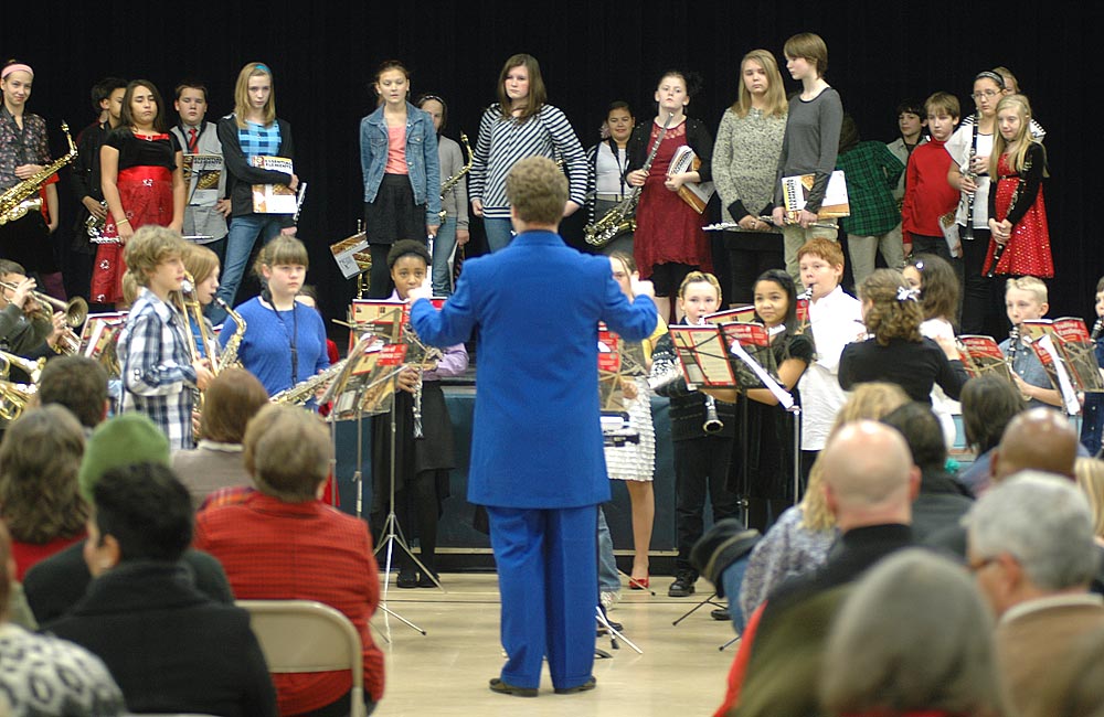 Over 100 students took to their instruments or wound up their vocal chords in a spectacular Mills Lawn School band and orchestra concert. Many of the students had only been playing their instrument since the beginning of this school year, but under the tutelage and leadership of new music director Brian Mayer, everyone played in an ensemble. The musicians included the 5th- and 6th grade orchestras and band, as well as the combined 5th- and 6th-grade choir, led by Jo Frannye Reichert conducting a group sing-along of the holiday classic, “Winter Wonderland.” (Accompanying on the piano is Faith Skidmore, MLS music teacher emeritus, and teacher to the young Jo Frannye!). The Mills Lawn School gym was filled to capacity with audience outnumbering the performers approximately two to one.