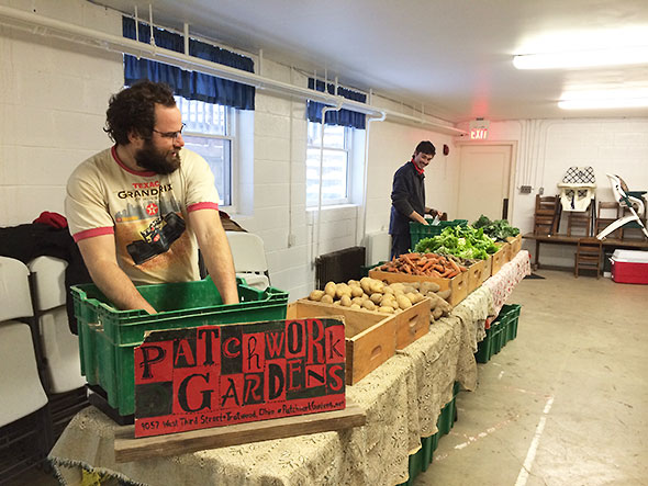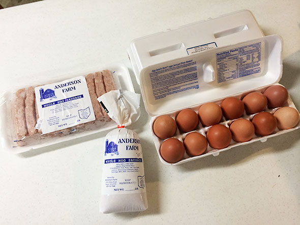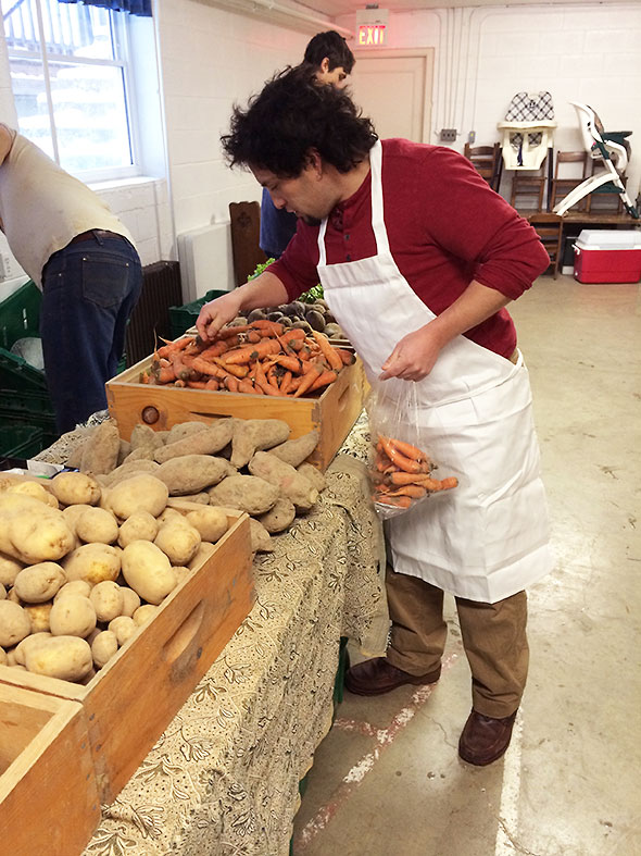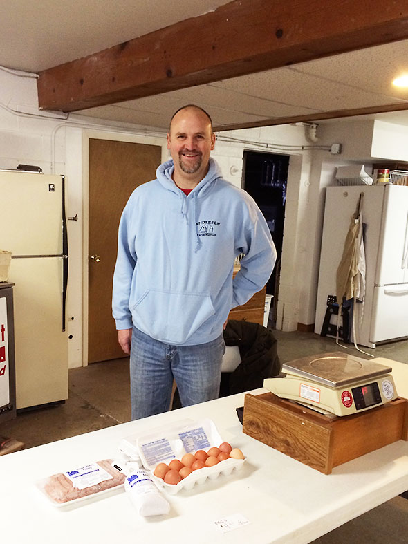 When relieved by Jason Clark, I return downstairs to find this week’s supply of kale gone. I order up the last head of lettuce, two sweet potatoes, and a couple pear-sized butternut squash. Mariano Rios joins me to stock up on carrots, and we discuss with Mark of Patchwork Gardens our plans for the produce. Next, I turn to the next table to talk to Doug Anderson about securing half of a pig. His booth has the savory makings of a hearty breakfast: eggs and sausage from Anderson Farms. Just this past week, he took a couple of hogs to the butcher, and we make plans for me to take possession of several ham steaks, pork chops and bacon slabs later in the week.