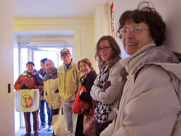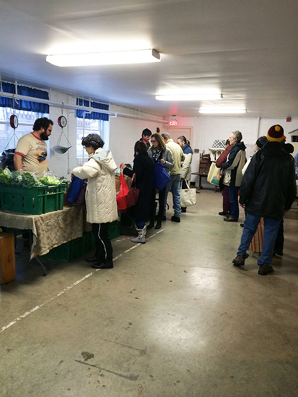 The first question I get is “When does the market open?” Though we open at 9am, a long line forms at 8:45am. At first we have three and then five and then eleven shoppers in queue. I let them in out of the cold, and we stand at the top of the stairs and peer longingly downstairs. Wally appears the foot of the stairs and, seeing our plight, asks for patience as final preparations are made.