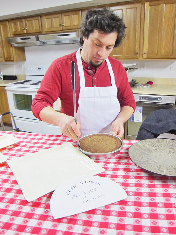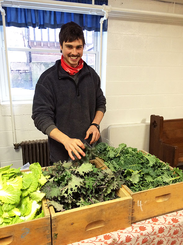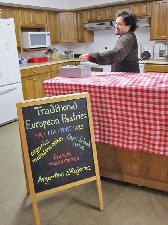 At the church, I arrive at 8:15 to a shuffle of carts and produce. Wally opened the church up just before I arrived, and the vendors are making ready for the market’s 9am opening. Tables are piled high with boxes, baskets, and trays. Patchwork Gardens alone lines up two dozen boxes of produce—bright orange carrots, bulbous sweet potatoes, and richly-veined winter greens. They begin bagging produce for the customers who will soon be waiting at the door. Transferring glistening gems from metal trays to display plates like an attentive jeweler, Mariano Rios provisions out his apple tarts, flourless cake, macarones, and alfajores. Nicole Manieri is stocking the market’s “cold and flu remedy” section with neat, well labeled packages of medicinal teas, elderberry syrup, and other time-tested curatives.