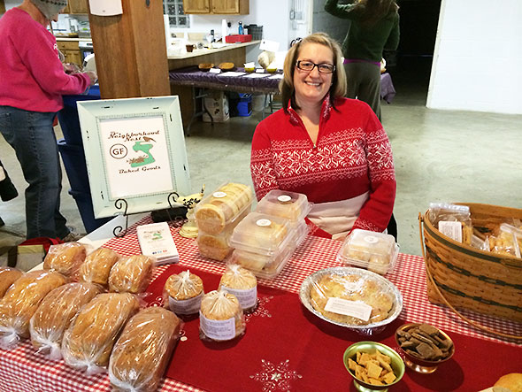 Tempting as the greens appear and endeared as I am to stories of cinema, I am looking for breakfast, so I veer away from the early crowd. I buy a satisfying apple tart from Mariano and a hot cup of herbal tea from Nicole and head back upstairs. At the top of the stairs, I relieve Wally from his station at the market table and sit to enjoy my treats. Mariano’s tart is stacked in crispy flaky layers, the apple on top baked to a creamy consistency. The fragrant steam of the tea soothes the tip of my snow-blasted nose restoring its natural rose color. My family arrives shortly afterwards, and I encourage them to seek out the cinnamon apple treats and caramel popcorn that Louise Berrier offers and that they love so well. A few minutes later, they arrive at back at the top of the stairs triumphantly holding their purchased goods.