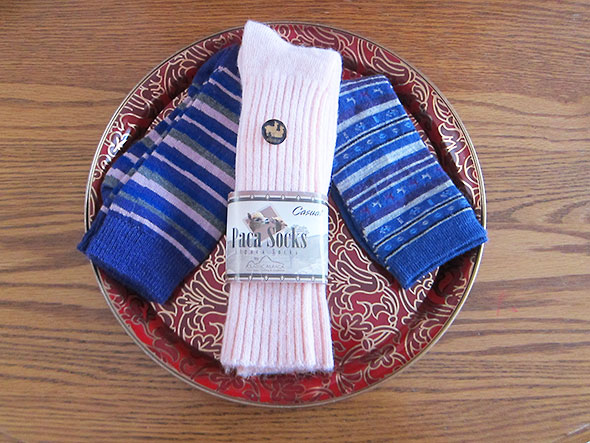 I have bought socks from Ms Hanes before. My favorites are a knee-high pair of dark brown socks that are reinforced at the shins to wear well with ski boots. Knowing the cold weather before me, I stocked up on three new pairs: A long, think pair of pink socks and two pairs of thin wool socks that would layer easily. I was particularly charmed by the blue, pink, and gray banded socks with little alpaca silhouettes adorning the blue bands. I lived in these socks and their brethern over the next week…the alpaca wool comfortable, snug, and warm over my feet.