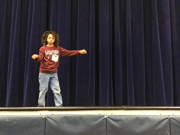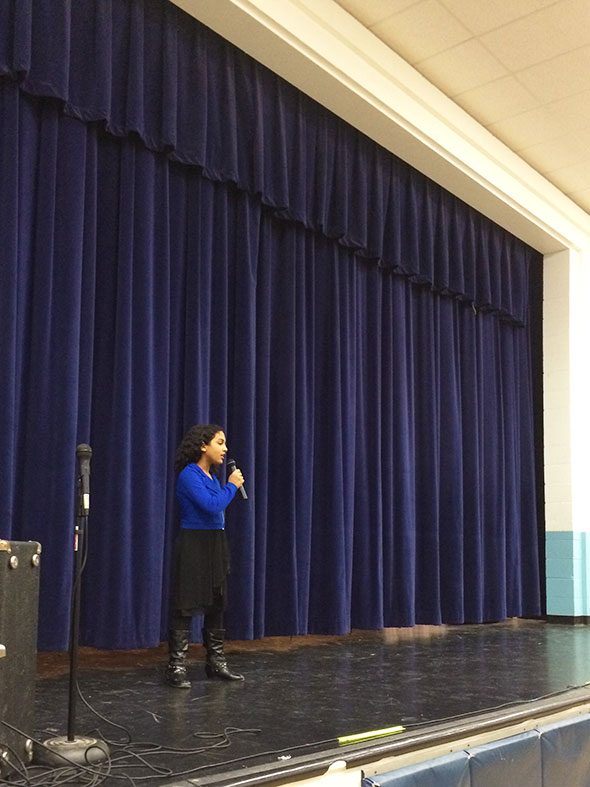 The young men and women of Mills Lawn School—from Kindergarteners to sixth graders—displayed an impressive range of talent. There was a puppet show on the dangers of talking to strangers; a winning activist speech on animal rights; bluesy vocals and sharp, crisp raps; original dances with crazy cool moves and exciting bright costumes of green, orange, bright blue, and yellow; and violin and piano works performed with confidence. One young man debuted a song he wrote “It’s not easy being king” as his father grooved on electric bass. Two comedy acts took the stage: a ventriloquist and his funny little buddy and the “Bomb brothers”, a standup duo who definitely did not bomb!