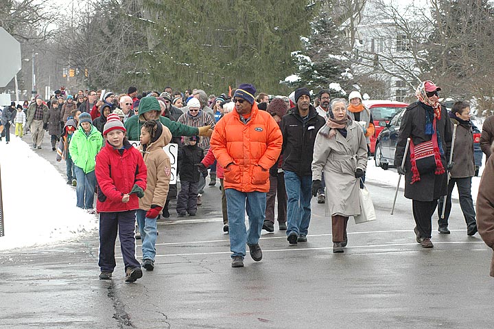 Marchers braved the cold slushy weather and sang the traditional “We Shall Overcome” and “This Little Light of Mine” while marching from Mills Lawn School through town and ending at the Central Chapel AME Church on High and Davis.