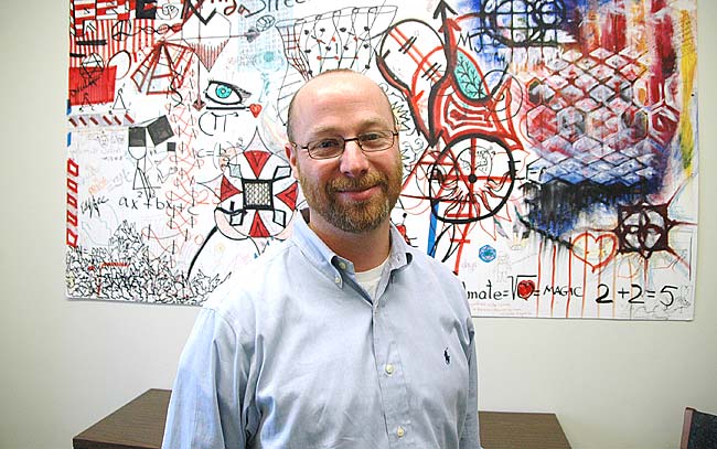 This month Dan Doron, of Columbus, joined Antioch College as its new director of communications. Doron has worked at several newspapers, the PR department of the Cleveland Clinic and Yale University, and he hopes to improve communication with the local community and the college’s neighbors. Here Doron stands before a piece of student artwork he found to adorn his walls. (Photo by Megan Bachman)