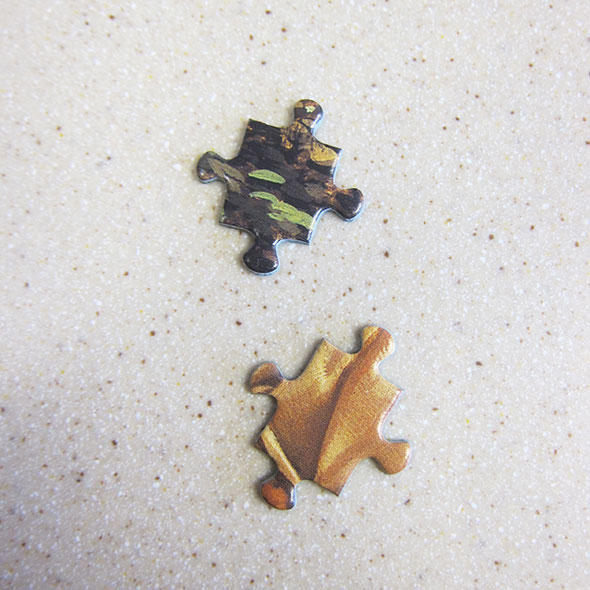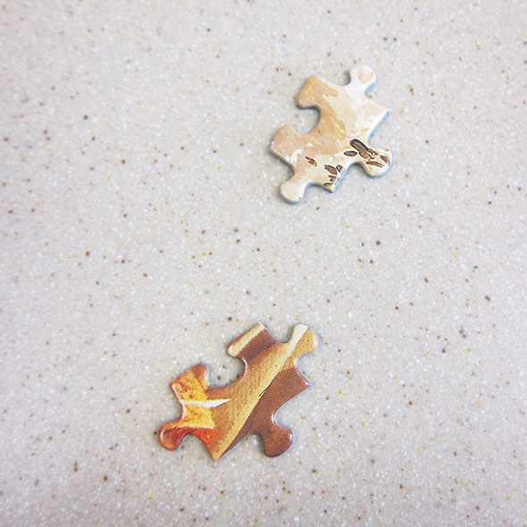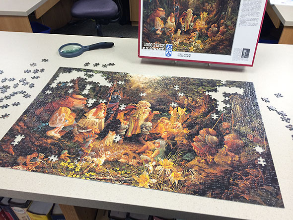 As days turned to weeks, I wondered if we would be allowed to finish the puzzle especially as progress though the wooded sections proved slow and difficult. My strategy altered again. Instead of matching patterns or shapes, I examined the quality of the print. In this way, I could separate out pieces belonging to the crisp canopy of leaves from the gloaming root-bound forest floor. Finally, enough pieces took their place that the way became easy again, and I began to wonder if I would be at the library when the puzzle was completed.