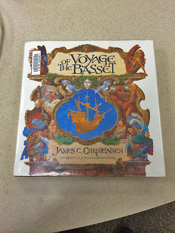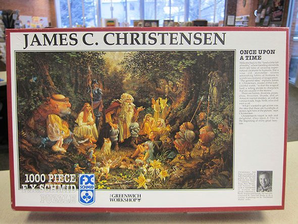 Over the month of January, several people worked diligently on the center of the puzzle. I shameless used the box cover to match shards of hair, skin, and cloth, this bead, that feather, and the many wooden staffs. As I worked, my admiration for the illustration grew. Each piece that fell into place revealed a new secret of the scene; previously unseen companions kept arriving in the glade falling under the spell of the storyteller’s tale. Sensing my delight in the puzzle, librarian Regan search the stacks and pulled James Christensen’s epic illustrated tale “Voyage Of The Basset” for me to take home so that I might enjoy Christensen’s sumptuous illustrations long after the library closed for the night.
