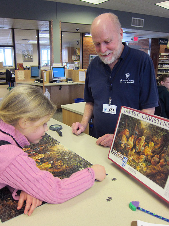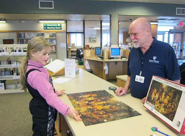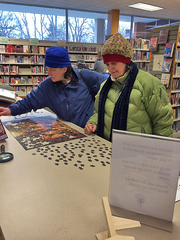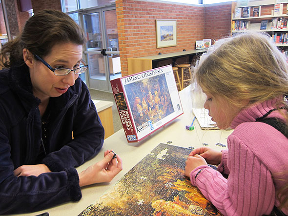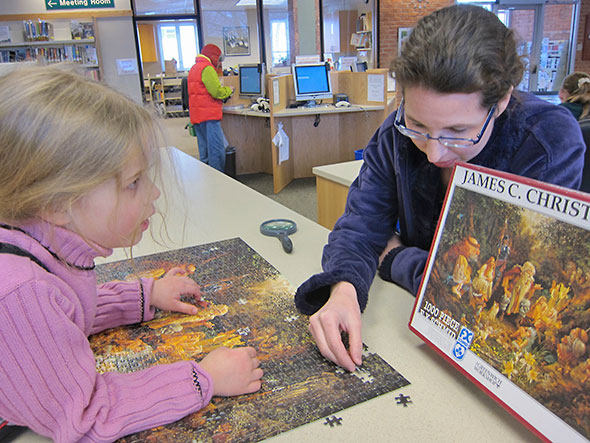 The snow day on Wednesday gave me the break needed for a final push. Dressed in thick boots and snow pants, my daughter joined me at the reference shelves where we found thirty-so wooded space to cover. The librarians echoed our excitement…”This is it! Today, today!” My daughter led the way positioning the remaining pieces, leaning close over the puzzle, and enjoying the textured run over the puzzle’s surface as much as its playful colors. After she corrected a piece I mislaid, I gave her full and final reign. She popped the final four pieces in under the appreciative eye of the library staff.