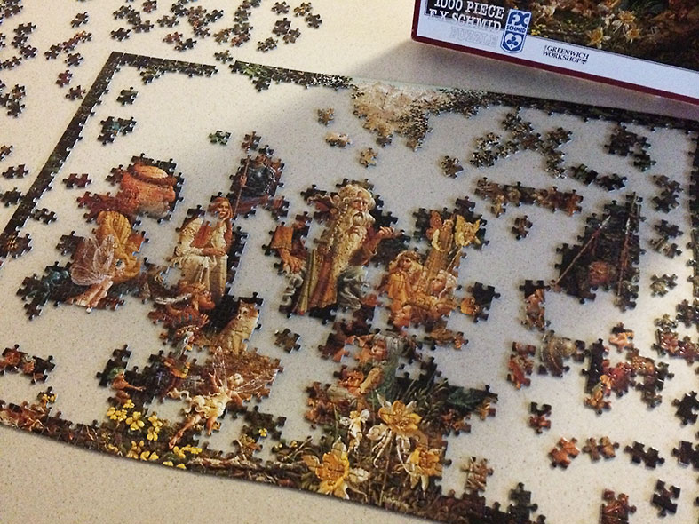 I joined a community project this past month. Shortly after the new year, a puzzle appeared atop the new reference shelf behind the main desk at the Yellow Springs Community Library. I could tell right away that it was an unusual puzzle. The first assembled pieces revealed the faces of the picture, an intricate collage of fairy tale characters gathered in a wooded glade to hear a great storyteller. The storyteller intoning “Once Upon a Time” had taken his seat, and a few fairies and two elfish sisters had found their places round his feet.